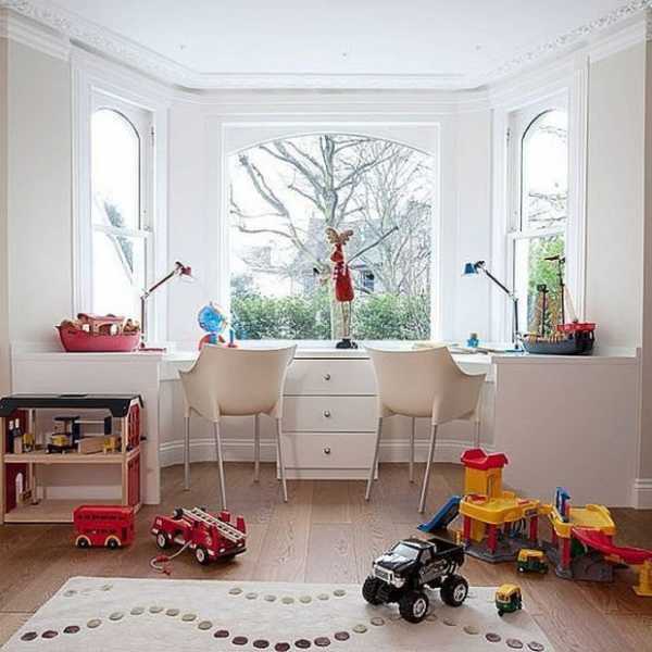 - Функции эркера как уголка для ребенка зависят от его возраста. Для школьника он может стать местом для учебных занятий, так как здесь отличное освещение. Для малыша – зоной игр и хранения игрушек.
