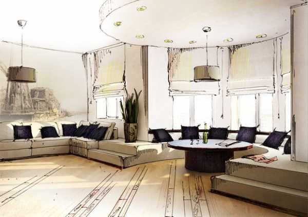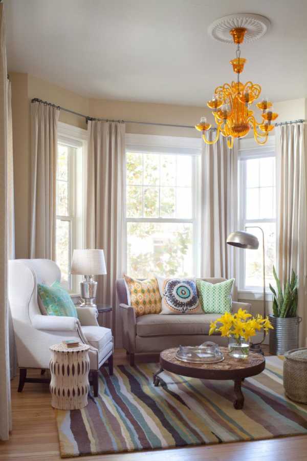 Дизайн гостиной комнаты с эркером выглядит очень необычно
