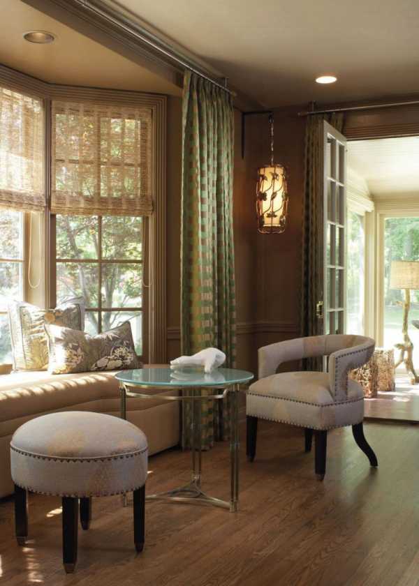 В этом случае пространство нужно оформить непринужденно, создав уютную атмосферу для отдыха. Подойдут небольшие диванчики по форме подоконников или несколько плетеных кресел вокруг чайного столика. Дополнить данную мебель стоит несколькими горшками напольных цветов, и уютными шторами.