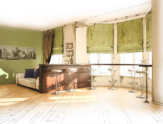 Зная о дальнейшей судьбе эркера, заранее позаботьтесь о его обустройстве для качественного отображения звука. Продумайте, как распределить окна, и куда поместить колонки (повесить на стену, под потолок или поставить на пол). Если вы решили повесить телевизор на стену, эркер может быть не застекленным вообще (но при таком решении днем будет попадать мало солнечного света). Лучше все же поместить его сбоку, оставив место и для окон.