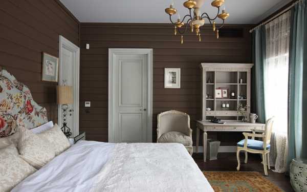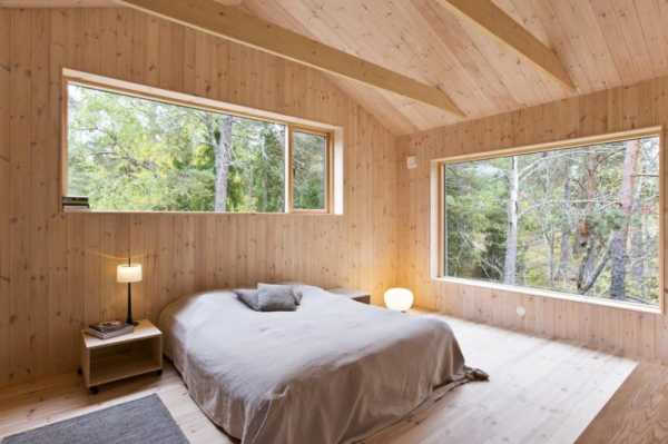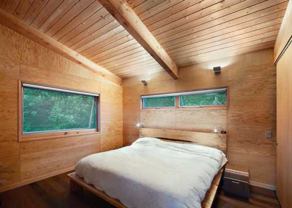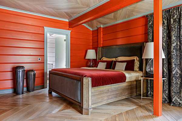 Отделку спальни лучше всего выполнять в темных тонах. Если дом сделан из темной древесины, то стены, пол и потолок спальни можно просто покрыть лаком.