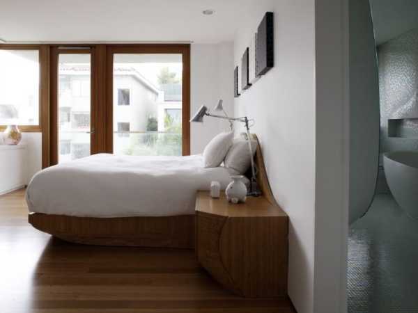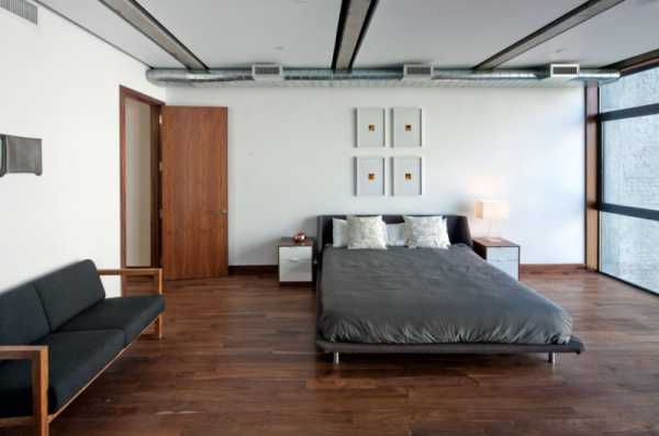 Современный интерьер спальни с применением натуральной древесины в отделке основных плоскостей.