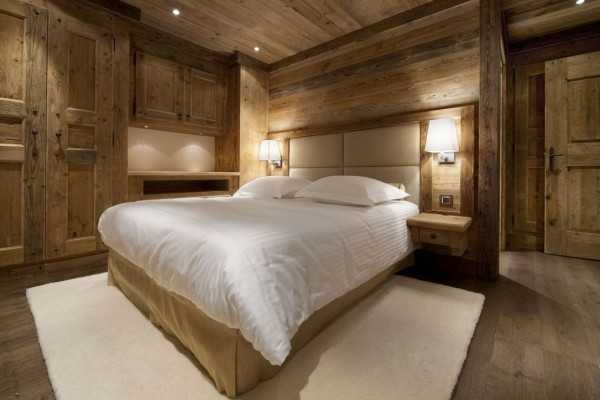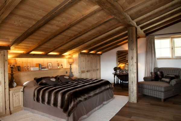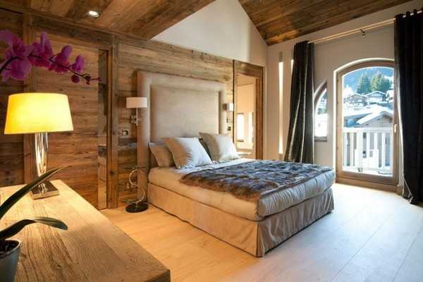 Шале представляет собой небольшой домик в горах, в котором раньше жили пастухи и охотники. Отличительная черта этого стиля от остальных – необработанные, грубые поверхности. В отделке используется камень и дерево. Мебель для спальни в стиле шале должна быть массивная, грубая и простая. Оформляется такой интерьер в спокойных природных оттенках: коричневом, песочном, древесном, пшеничном. Лучше полностью отказаться от центрального источника освещения и использовать небольшие светильники, расставленные по всему помещению. Для декора, как правило, используются рога и шкуры животных, текстиль, кованые элементы, оружие.