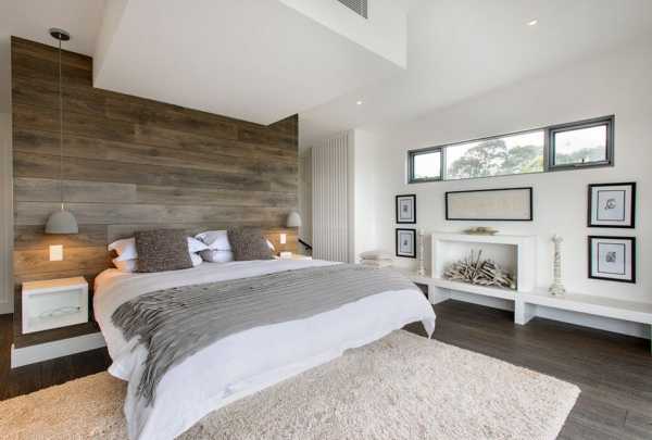 Если внутри комнаты решено использовать темное дерево, желательно одну или две стены сделать гладкими и светлыми. Это можно осуществить путем окрашивания или оштукатуривания стен, предварительно обшитых, например, гипсокартоном. Другой вариант – можно «разбавить» переизбыток насыщенных оттенков дерева светлым текстилем и мебелью легких пастельных цветов. Еще, как вариант, делается просто спальня с деревянной стеной.