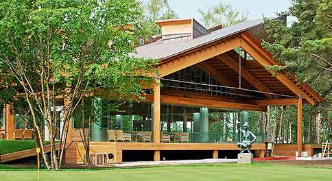 Дерево и стеклоЗдание гольф-клуба с рестораном, каминным залом и помещениями для гольфистов прямоугольной формы в плане, обозначенное в пространстве легким конструктивным контуром несущих колонн с декоративной подсветкой, растворяется в ландшафте благодаря прозрачным стеклянным стенам…