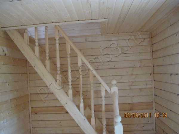 Деревянная, тетива изготавливается из бруса 90х140мм, е/в. Ступени: сухая доска 30х250мм, впиливаются в тетиву, устанавливаются резные столбы, перила и точеные балясины. |