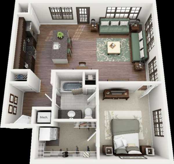 Дом, который будет использоваться в качестве временного жилища, например, на даче, вполне допускает открытую планировку даже при наличии только одного этажа. Это означает, что внутри будет минимум перегородок и максимум свободного пространства. При этом все необходимые помещения будут сохранены.