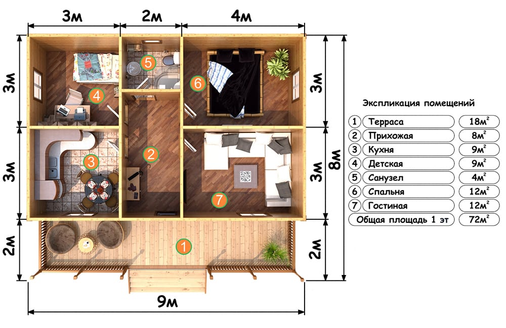 Планировка дома 9х9 одноэтажный из бруса