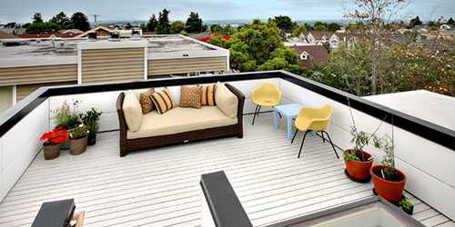 - Эксплуатируемая плоская кровля. Этот тип крыши проектируется и монтируется, чтобы использовать поверхность как дополнительное пространство, на котором можно находится людям. Стоит такое удовольствие на порядок выше неэксплуатируемых аналогов, в том числе, за счет затрат на проект. Сконструировать эксплуатируемую кровлю должен профессиональный архитектор, ведь на нее ложится серьезная нагрузка. Для основания настила используют бетонные плиты или прочные деревянные балки. Но возможность использования деревянного основания зависит от нагрузки, так как под большим весом оно может деформироваться.