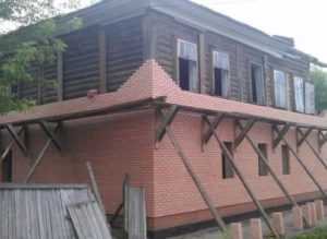 Кирпичная кладка. Такую облицовку делают в том случае, когда надо закрыть некачественный брус или усилить жесткость деревянных стен. Кладка обязательно должна упираться на фундамент или на цоколь, выступающий на 20 см от стены.