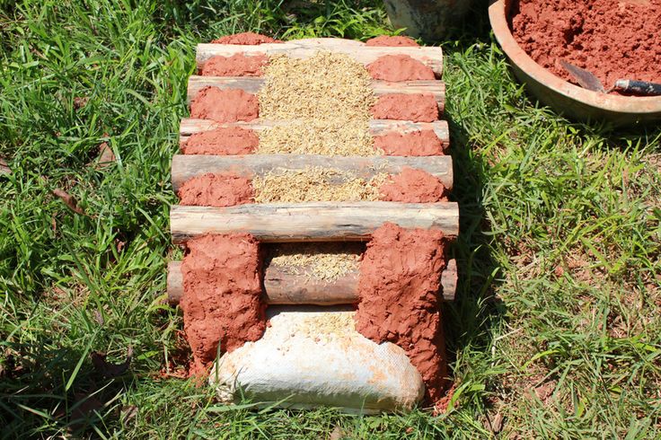 Глина и песок смешиваются с водой в корыте и туда добавляется сено — все это замешивается до нужной консистенции. Эта смесь выкладывается на дрова и таким образом из нее и дров выкладываются стены.