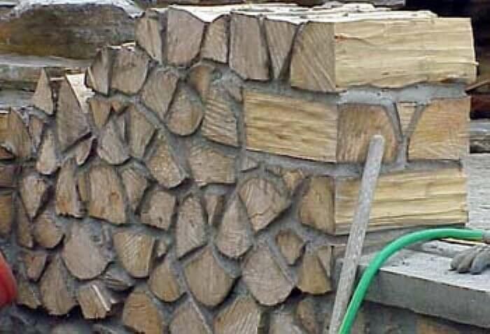 Технология изготовления дома из дров и глины похожа на ту, которая используется при возведении кирпичного здания. Однако кирпичи заменяют колотыми или цельными кусками древесины.
