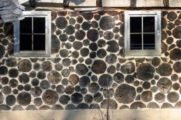 В этом доме, Рис. 1, стены выложены из коротких бревен — поленьев, уложенных на цементно-песчаный раствор поперек стены. Толщина стены 200-600 мм.