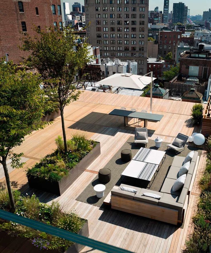 Но самое лучшее в этом великолепном городском особняке — красивый открытый сад с частной террасой на крыше, куда можно попасть через двойные французские двери, предлагая уединение от шума и суеты Нью-Йорка, а также безупречные панорамные виды.
