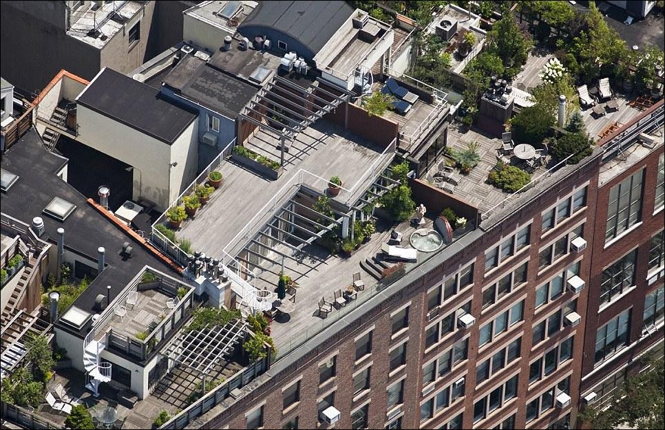 Три небольших особняка, расположившихся на крыше старого жилого дома на Бродвее в Нью-Йорке.