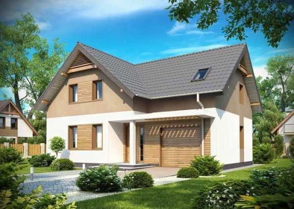 Типовой польский проект дома с прямой четырехскатной крышей и небольшим фронтоном над крылечком. Большие свесы кровли практичны и красивы
