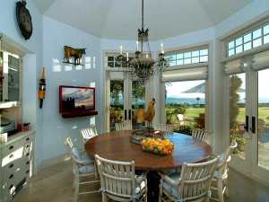 Если эркер будет располагаться на кухне, то здесь имеет смысл оформить и обеденную зону. Так, можно поставить круговой или угловой диван, стол, что позволит принимать пищу всей семьей. Проще всего сделать обеденную зону, если строится дом из бруса с эркером, когда он четкой геометрической формы. Столовая зона может быть оформлена разными способами: с диваном вдоль окна, если выступающая часть в форме трапеции, или традиционным расположением столовой группы у окна. Это самый простой способ организовать планировку в эркере.