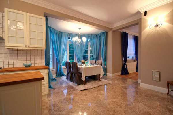 - эркер можно и не выделять как композиционный акцент в интерьере, что станет удачным решением при оформлении обеденной зоны на кухне или в гостиной.