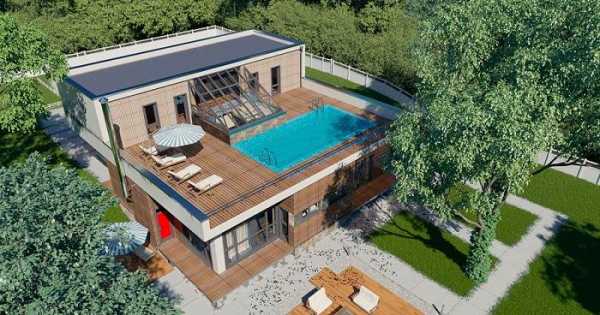 - Проекты домов с плоской крышей, оборудованной пляжной зоной. Бассейны и искусственные водоемы на крыше частного дома, в наши дни, уже перестали быть диковинкой. Обычно этот прием используется на участке, площадь которого невелика. Бассейны на крыше можно соорудить любой формы, а также открытого типа или закрытого. Основные требования — подвод коммуникаций и прочность конструкции дома. Рядом с водоемом, как правило, размещают шезлонги и навесы, защищающие от прямых солнечных лучей, также можно дополнить обстановку зелеными насаждениями.