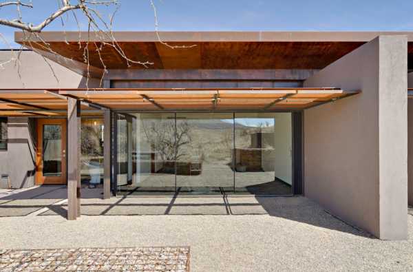 В дизайне одноэтажного коттеджа с плоской крышей металлические элементы из фальца на фасаде эффектно выступают за пределы стен, что придает зданию индустриальный вид.