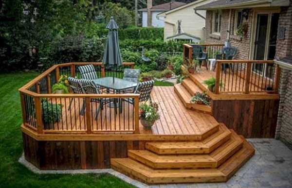 К самым простым вариантам можно отнести возведение стандартного прямоугольного настила, который будет иметь минимум декоративных деталей. Однако фигурные конструкции смотрятся намного привлекательнее. Нередко в целях повышения практичности террасы ее выполняют многоуровневой. Такое решение окажется кстати, если веранда будет использоваться множеством людей разного возраста.