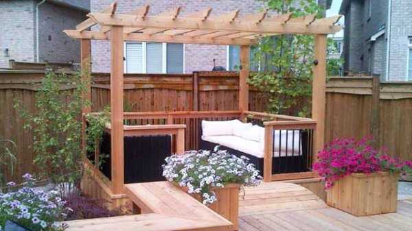 Нередко террасы выполняются комбинированными. Их совмещают с перголами или беседками. Также вблизи террасы обычно оборудуется искусственный водоем. Простой бассейн выполняется надувным. Возможно создание более сложной конструкции – большой котлован, отделанный плиткой. Нередко на террасе можно увидеть барбекю-стол. В таком случае он надежно изолируется от деревянного настила и помещается подальше от зоны отдыха. Такую террасу можно видеть на фото снизу.
