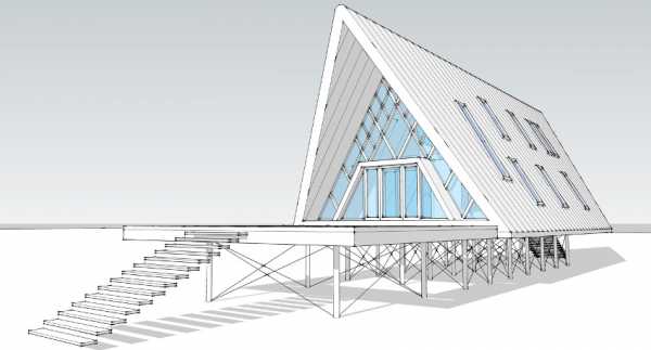 Визуально строение выглядит как треугольник. Его каркас сооружен из треугольных рам. Особенность таких домов – отсутствие стен: двускатная кровля исходит от фундамента, иногда из цоколя. Среди преимуществ домов-шалашей можно отметить: