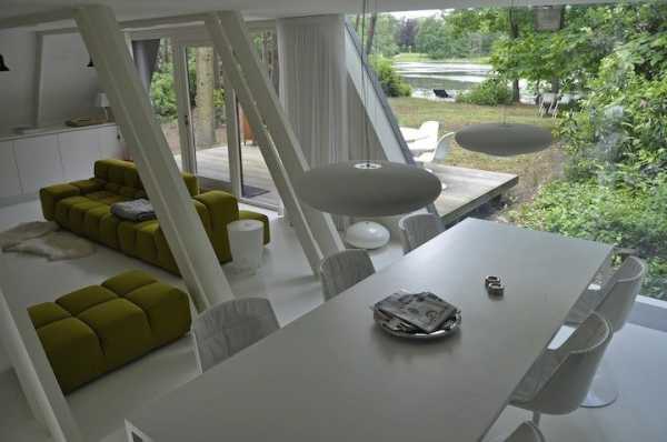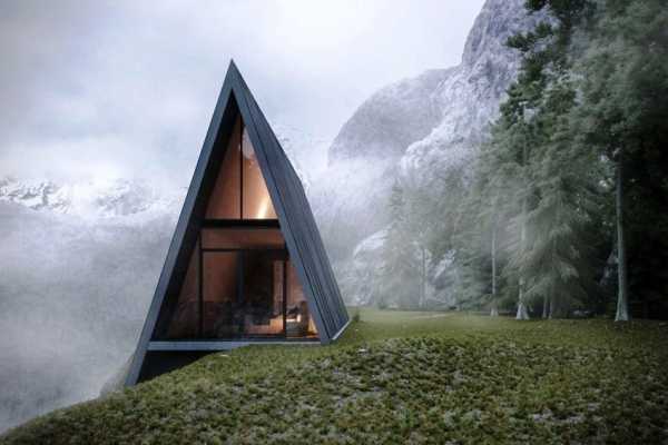 Поскольку внутреннего пространства в треугольных постройках не так много, с целью экономии полезной площади каминная и печная труба выносится за пределы здания. На фото дома в лесу с таким дизайном выглядят очень эффектно. Хотя данный подход имеет и недостатки, так как значительная часть тепла будет уходить на улицу.