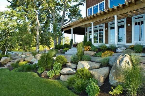 На таком фоне особенно выигрышно смотрятся постройки, выполненные в серо-коричневых тонах природного камня и состаренной древесины. Яркой динамичности пейзажу добавляют цветущие растения и декоративно-лиственные кустарники.