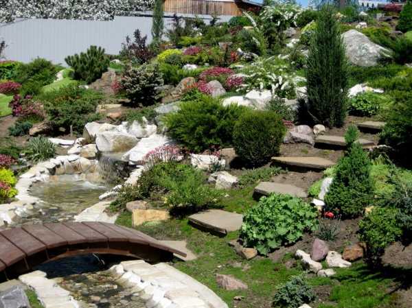 Из камня в альпийском саду выполняется практически всё – дорожки (обязательно – извилистые), сухие ручьи, мостики, насыпи, подиумы, рокарии и альпинарии.