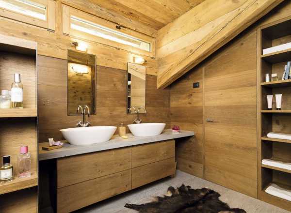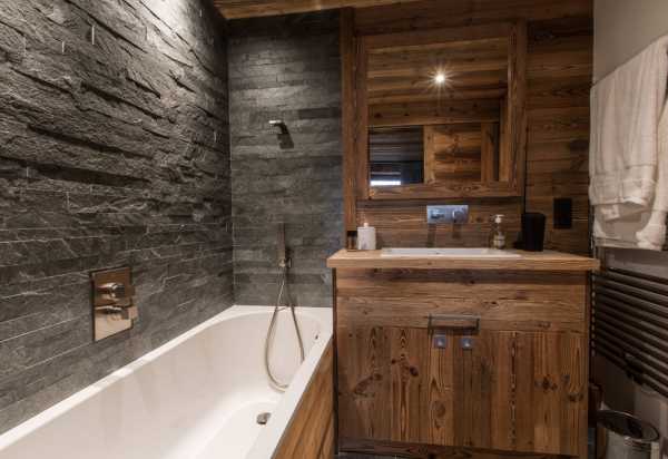 Ванная или туалет в альпийском стиле предполагает использование природных текстур, вертикальное озеленение, а при должных габаритах – отдельно стоящую сантехнику. Хотите ощущения присутствия в Альпах? Душевая в виде грота с потолочной душевой лейкой, сауна, встроенная каменная столешница для раковины, на полу плитка под дерево или доски тика или лиственницы, потолок с подсветкой под небо – вот один из вариантов оформления санузла. Можно обыграть по-другому. Допустим, встроенная ванная, вокруг нее облицовка майоликой, в штукатурку стен также вмазаны несколько плиток, деревянная мебель под раковиной, легкие витые светильники по обе стороны от зеркала, пуф с подушкой, на верху балки со встроенными светильниками – тот же стиль, но в более мягком проявлении.