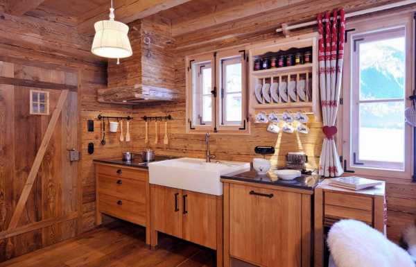 В стиле альпийского шале кухня оформляется в соответствии с общим интерьером. В таком случае хорошо смотрится деревянная посуда и столовые приборы. Столы можно украсить вышитыми скатертями.