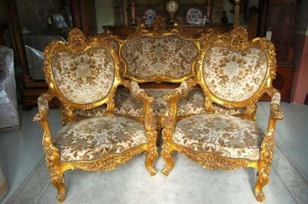 Изящные изогнутые ножки, наличие позолоченной или бронзовой отделки, использование чехлов — отличительные признаки мебели стиля рококо.