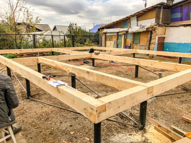 На обвязку идет обычный брус сечением не менее 100х150 мм: чем габаритнее строение, чем больше в нем помещений, чем сложнее фундамент и больше свай, тем толще должен быть брус.