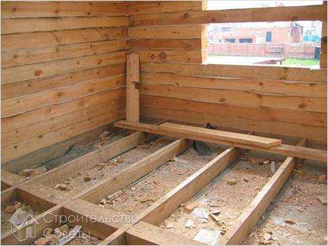 Пол в таких домах обычно выполняют в два слоя. То есть сначала кладутся лаги. Лаги лучше всего класть на столбы. Такие столбы возводятся не во время возведения фундамента, а в то время, когда уже стоят стены.