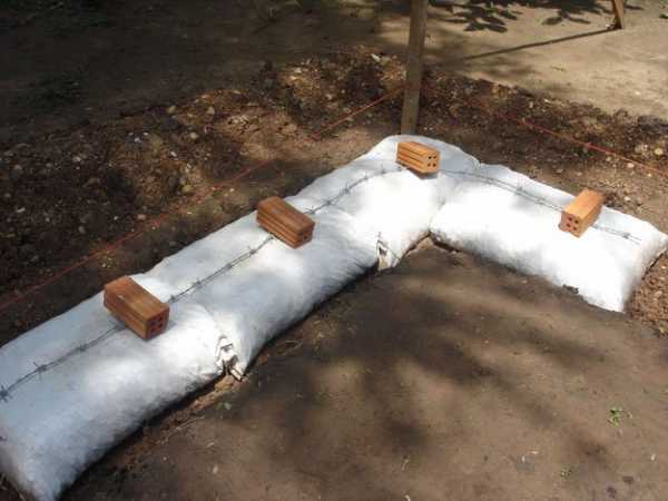 Будьте особенно внимательны при устройстве первого ряда кладки мешков. Все необходимо выполнить в строгом соответствии с ранее нанесенной разметкой. Утрамбуйте мешки и немного смочите их водой.