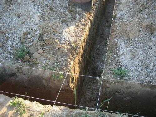 Подготовьте фундамент для будущего дома. Параллельно с этим выполняйте заготовку основного стройматериала для возведения рассматриваемого дома – мешков, наполненных утрамбованной землей. Для фундамента выройте траншеи глубиной порядка 50-60 см. Ширину подбирайте индивидуально – она должна соответствовать ширине мешков с землей.