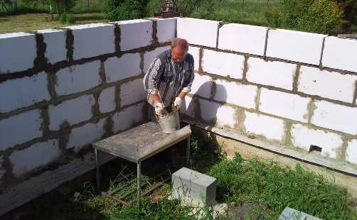 Достигнув высоты роста человека, можете начинать смещать каждый ряд укладываемого материала для повышения прочности возводимых стен.
