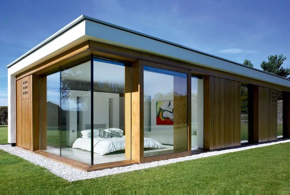 Этот сборный дом немецкого производства в Суррее, Великобритания, описывается как «современный из дерева и стекла», согласно описанию. Поразительное стеклянное здание имеет стеклянные полосы, выходящие на его дизайн в стиле Баухаус, с эффектной черной рамой.
