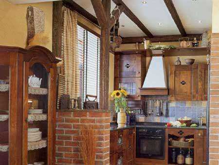 В мебели сельского стиля, установленной на кухне, не должно присутствовать единства и ощущения, что они покупались в комплекте. Грубоватый массивный стол, шкафы без резных элементов и стулья отличаются простой геометрической формой и не имеют изысков. Рядом с ними располагают кресла-качалки и кожаный диван, гармонично вписывающийся в кухню больших размеров.