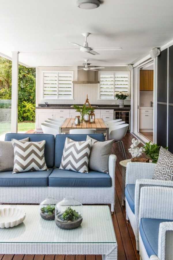 Размера веранды 6 х 9 м² вполне достаточно, чтобы обустроить ее как комнату отдыха или обеденную зону. Поставьте в комнате мягкую мебель, стол-трансформер, который легко превращается из журнального в полноценный обеденный, кресло качалку или шезлонг. Обустройство закрытой веранды к дому полностью зависит от вашей фантазии и наличия доступных средств.