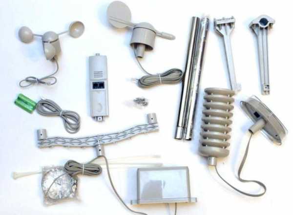 Устройство обладает очень богатой комплектацией, причем каждый элемент рассчитан на определение определенных параметров. Здесь есть анемометр, который определяет скорость ветра, причем его направление будет измеряться за счет специального электронного флюгера. Он будет считывать этот показатель относительно сторон света, поэтому при установке нужно будет ориентировать его по соответствующим меткам, расположенным на корпусе изделия. Оба этих элемента способны выдерживать порывы ветра вплоть до 50 м/с. Эти модули объединяются в блок за счет обыкновенных телефонных разъемов RJ11. Датчик дождя показывает количество выпавших осадков. Солнечная панель предназначена для измерения интенсивности освещения, к тому же она оборудована солнечной батареей, следовательно, способна работать полностью в автономном режиме. Как утверждают владельцы данной станции, ее можно использовать как в быту, так и для проведения профессиональных измерений метеоусловий.