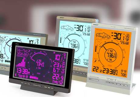 Метеостанции отображают анимированный прогноз погоды. Корпуса моделей выполнены в современном технологичном стиле из текстурного пластика с хромированными кнопками.