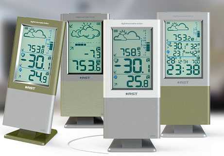 Погодные станции оснащены системой автоматического изменения цвета подсветки в зависимости от прогноза погоды или изменения температуры воздуха. Во всех моделях компании — часы с инновационной системой коррекции времени и даты по радиосигналам точного времени rcc 77.5 kHz, адаптированной для России. Метеостанции RST — образец роскошного стиля с изысканными деталями дизайна.