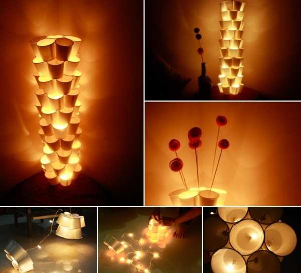Своими руками из дерева, металла, ткани, бумаги, пластика или ниток реализуют невероятные замыслы. Пример создания светильника из пластмассовых стаканчиков: