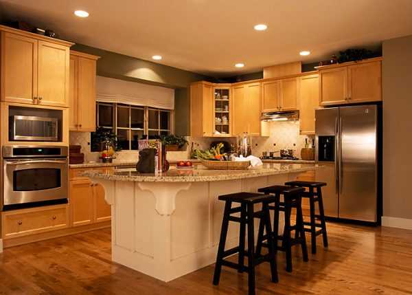 Точечное освещение на кухнеВ ходе электролюминесценции происходит перемещение электронов внутри диода, формируется фотонная энергия. Элементарные частицы электромагнитного излучения – поток света, которым обладают уличные светодиодные и домашние потолочные светильники.