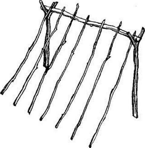 Затем на горизонтальную жердь и землю с некоторым наклоном укладывают ветки или короткие жерди. Ну, а на них уже укладывают пучки травы, полосы коры деревьев или просто закладывают множеством мелких ветвей или лапником хвойных деревьев. Жильё готово, можно ночевать.