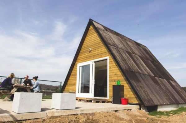 Каркас дома-шалаша построен из деревянных балок, образующих форму буквы «A» от основания к вершине.