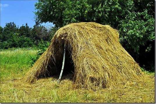 Прежде всего нужно осмотреть место будущего ночлега. И прикинуть, как бы можно было бы укрыться. При этом не запрещается проявить смекалку и даже наоборот. Как сделать шалаш, если нет деревьев вообще и негде взять жерди, но есть кусты. Для этого макушки кустарников связывают в виде шатра и укрывают травой. Всё, жилище готово. Забирайтесь внутрь.
