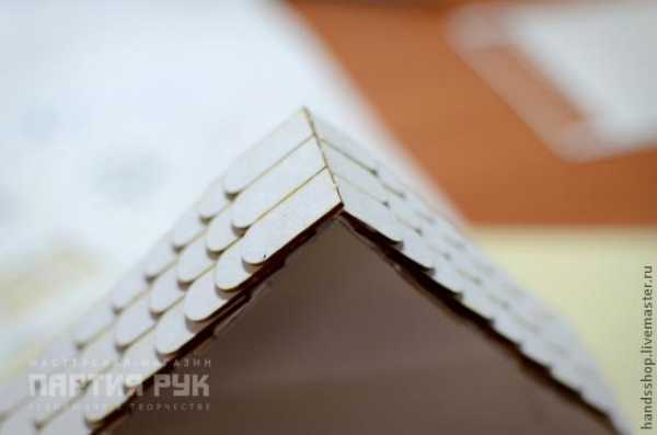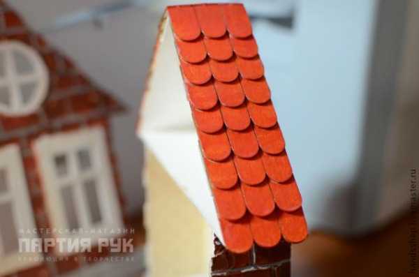 Каждому дому нужна хорошая крыша — и черепица отличное решение! Я воспользовалась готовой вырубкой с черепицей, но можно вырезать её и в ручную. Размер черепичек 1х2 см. Приклеиваем черепицу рядами по 3 штучки начиная с низу, хорошо смазываем поверхность крыши и предыдущего ряда церепицы ПВА, аккуратно прижимаем папьцами каждый ряд и даем ему так схватиться. Процесс этот достаточно долгий и глубокомысленный… Нахлест у черепицы в половину длинны.